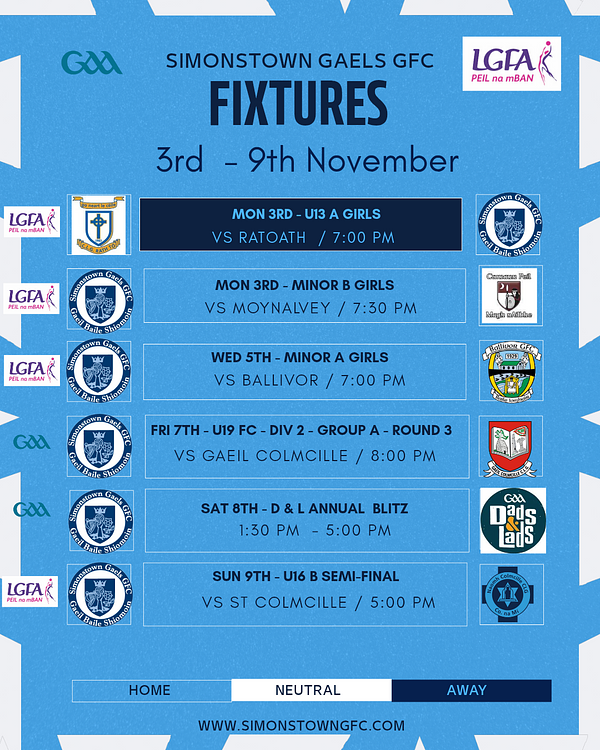Starting on Monday evening our U13 A girls take on Ratoath in Ratoath, while our Minor B girls face Moynalvey in Simonstown.